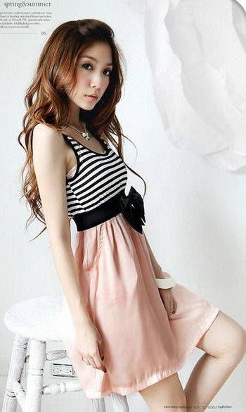 ชุดแซกแขนกุดตัดต่อด้วยผ้าค๊อตตอนลายทางช่วงบนกระโปรงสีโอรสผ้าโฟลีเอสเตอร์ เอวเป็นยางยืด
