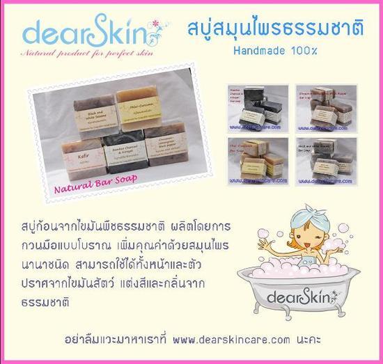 สบู่ของ dearskin สามารถใช้ได้ทั้งหน้าและตัว โดยไม่ทำให้ผิวแห้งตึง ทั้งยังบำรุงผิวด้วยคุณค่าสมุนไพรนานาชนิด ไม่เติมสี ใช้กลิ่นจากน้ำมันหอมระเหยธรรมชาติ และกลิ่นของสมุนไพรในสูตรนั้นๆ