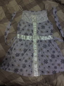 เสื้อลายดอกสีม่วงอ่อน มีลูกไม้ตรงหน้าอกและระบายลูกไม้ตลอดแนวของกระดุม มีโบว์ให้ผูก จะผูกไว้ข้างหน้าหรือข้างหลังก็ได้ ชุดนี้น่ารักเหมาะสำหรับคนตัวเล็กนะคะ สอบถามทางโทรศัพท์หรือทางอีเมลล์คะ ส่งฟรีค่ะ