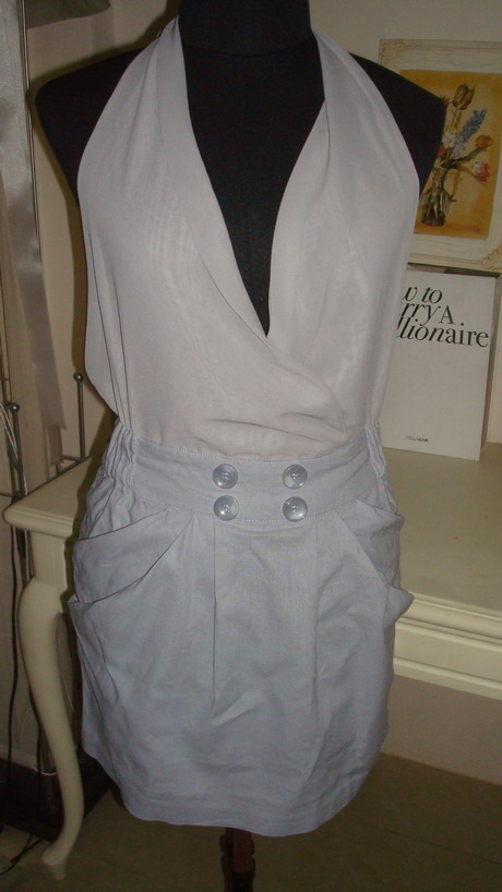 เป็นชุดเเซค สีเทาอ่อน ฟรีไซด์ ด้านบนเป็นผ้าซาดิน ด้านล่างเป็นผ้ายืด ใส่กับเกาะอก หรือ เสื้อกล้าม