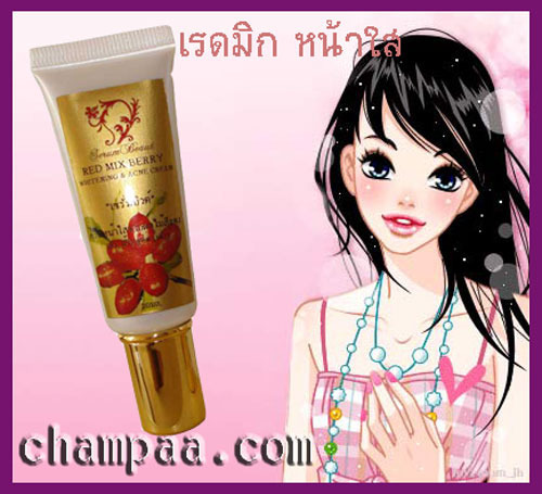 ครีม หน้าใสจากสารสกัดผลไม้สีแดงหลายชนิด ช่วยลดเม็ดสีผิวหมองคล้ำ รองด่างดำ ลดฝ้า เพื่อผิวหน้าใส และเนียนชุ่มชื้น ด้วยมอยซ์เจอร์ไรเซอร์ชนิดบางเบาซึมซาบไว เนื้อครีมจะซึมซาบสู่ผิว ไม่เหลือความเหนอะหนะ สัมผัสความนุ่มนวลของผิวได้ทันที ช่วยลดและป้องกันการเกิดสิวได้ดี ด้วยความเปรี้ยวและฝาดของผลไม้บางชนิดในส่วนผสม และช่วยผลัดเซลล์ผิวที่ตายแล้วเผยผิวใหม่ที่ใสกว่า อย่างนุ่มนวลเพราะเป็น AHA จากผลไม้แท้ๆ รอยดำจากสิว ฝ้า และรอยดำ ของสีผิวที่ไม่เรียบสม่ำเสมอจะลดลง ผิวเรียบเนียนดูสว่างขึ้น