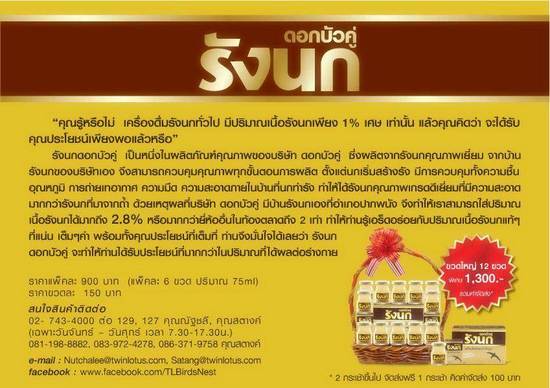 ดอกบัวคู่ มีบ้านรังนกเองที่อำเภอปากพนัง จึงเราสามารถใส่ปริมาณเนื้อรังนกได้มากถึง 2.8% หรือมากกว่ายี่ห้ออื่นในท้องตลาด