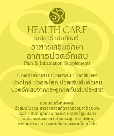 ขอแนะนำอาหารเสริมเอสอาร์เฮลท์แคร์ อาหารเสริมรักษาอาการปวดอักเสบ ที่ชาวอเมริกันนิยมรับประทานเพื่อรักษาอาการปวดอักเสบจาก ปวดข้ออักเสบ ปวดหลัง ปวดต้นคอ ปวดไหล่ ปวดสะโพก ปวดเส้นเอ็นอักเสบ ปวดอักเสบจากกระดูกกดทับเส้นประสาท ที่ได้ผลดีที่สุดในปัจจุบัน