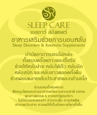 ขอแนะนำสุดยอดอาหารเสริมที่ชาวอเมริกันนิยมรับประทานเพื่อรักษาโรคนอนไม่หลับ ไม่ว่าจะเป็นอาการนอนไม่หลับครั้งคราวหรือนอนไม่หลับเรื้อรัง Sleep Disorders & Insomnia ที่ได้ผลดีที่สุดในปัจจุบัน เอสอาร์สลิพแคร์ จะช่วยให้นอนหลับง่าย หลับได้เร็ว หลับลึก หลับสนิท และหลับยาวตลอดทั้งคืน ช่วยให้เส้นประสาทและกล้ามเนื้อทั่วร่างกายผ่อนคลาย ช่วยฟื้นฟูซ่อมแซมเซลล์และเนื้อเยื่อทั่วร่างกายขณะนอนหลับอย่างมีประสิทธิภาพ จึงทำให้ร่างกายหายปวดปวดเมื่อยกล้ามเนื้อปวดเมื่อยตามร่างกายอย่างรวดเร็ว ตื่นขึ้นด้วยความสดชื่นกระปรี้กระเปร่า ไม่อ่อนเพลียไม่เหนื่อยล้า