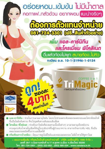 คอกาแฟ..กลัวอ้วน แนะนำจริงๆ เพิ่มแอลคานิทีนและโครเมียม พิโคลิเนต ครีมเทียมจากถั่วเหลืองดื่มแล้วท้องไม่ผูก สบายท้อง..ไม่หิว ทะเบียน อ.ย. 10-1-31946-1-0124 http://www.vandara.in.th/product-th-779136-กาแฟทรีเมจิก+TriMagic.html (ต้องการตัวแทนจำหน่าย!!!) โทร. 081-724-3301