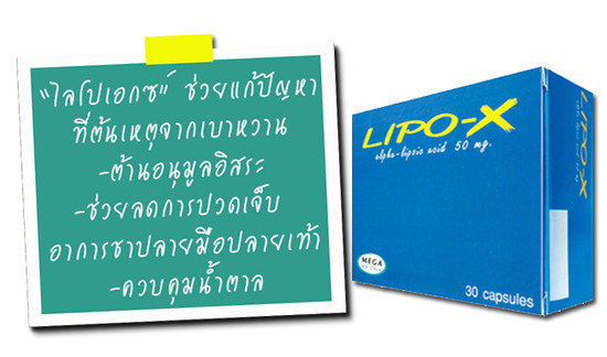 แม่ดิฉันเป็นเบาหวานมาหลายปี กินยาhttp://www.megawecare.co.th/thai/products_detail.asp?id=34">เบาหวานและhttp://www.megawecare.co.th/thai/products_detail.asp?id=34">วิตามินบีที่หมอสั่งเป็นประจำ วันก่อนไปที่ร้านขายยา เภสัชกรเขาบอกว่าhttp://www.megawecare.co.th/thai/products_detail.asp?id=34">โรคเบาหวานเป็นโรคที่มีผลทำให้ระบบประสาทและอวัยวะในร่างกายเสื่อมเร็ว แนะนำให้http://www.megawecare.co.th/thai/products_detail.asp?id=34">กินไลโปเอกซ์ ที่เหมาะมาก ช่วยแก้ปัญหาที่ต้นเหตุ เพราะเป็นสารhttp://www.megawecare.co.th/thai/products_detail.asp?id=34">ต้านอนุมูลอิสระที่ดี ทำให้ระบบต่างๆ ในร่างกายเสื่อมช้าลง ช่วยลดการปวดเจ็บ อาการชาปลายมือปลายเท้าจากจากเบาหวาน แถมhttp://www.megawecare.co.th/thai/products_detail.asp?id=34">ไลโปเอกซ์ยังทำให้ควบคุมน้ำตาลได้ดีขึ้นด้วย ช่วยให้อยู่กับhttp://www.megawecare.co.th/thai/products_detail.asp?id=34">โรคเบาหวานอย่างสบายใจ