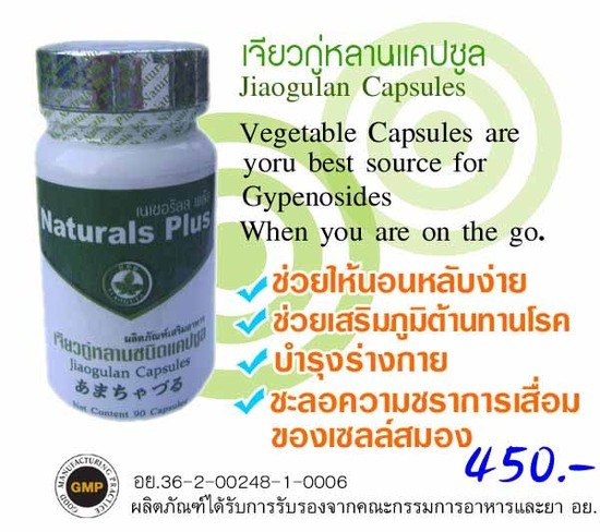 เยี่ยมชมเวปไซต์ผู้ขายได้ที่ http://www.bokto.com/">www.bokto.com เจียวกู่หลาน สุดยอดสมุนไพรแห่งชาติ ปี48 กรมวิทยาศาสตร์การแพทย์ยืนยันมีความปลอดภัยสูง ไม่มีพิษเฉียบพลันหรือพิษเรื้อรัง เจียวกู่หลานมีสารออกฤทธิ์ จิบเป็นโนไซด์ มีโครงสร้างคล้ายในโสมคน และมีสารชาโปนิน 82 ชนิด หรือมีมากกว่าโสมคนถึง 3 เท่า เจียวกู่หลานได้รับสมญานามว่า สมุนไพรอมตะ หรือโสมใต้ Southern Ginseng มีประโยชน์ทั้งเชิงป้องกันและบำรุงร่างกาย เจียวกู่หลานได้รับความสนใจจาก นักวิทยาศาสตร์ทั่วโลก มีรายงานการวิจัย สรรพคุณและสารออกฤทธิ์กว่า 200 งานวิจัย เจียวกู่หลาน แคปซูล ช่วยให้นอนหลับง่าย เสริมภูมิต้านทานโรค บำรุงร่างกาย ชลอความชรา การเสื่อมของเซลล์สมอง โรคที่สมุนไพรเจียวกู่หลาน (Jiaogulan) ช่วยบรรเทาได้ ผมหงอกก่อนวัย ปวดหัวเรื้อรัง ปวดหัวข้างเดียว ลดความเครียด อาการอักเสบของเยื่อบุเมือกในปาก เหงือกอักเสบ ไอ โรคภูมิแพ้ แก้อักเสหะ ไขมันในเลือดสูง เชื้อราที่เท้า ลำไส้เล็กอักเสบ หูช่องกลางอักเสบ โรคผิวหนัง หนังหยาบแห้งและหนา โรคปวดตามข้อ ตามกล้ามเนื้อ โรคเก้าท์ มะเร็งต่อมลูกหมาก/เนื้องอก การขาดโปรตีนของกระดูกอ่อน นิ่วในถุงน้ำดี โรคตับอักเสบ ช่วยการย่อยอาหาร กระเพาอาหารอักเสบ กระเพาะอาหารผิดปกติ ปวดหลัง คลอเรตเตอรอลสูง ไข้หวัด โรคภูมิแพ้/ไข้ต่อการกระตุ้น เนื้องอก ความดันโลหิตต่ำ ปวดเอว อาการปวดเนื้อจากเส้นปราสาทหดตัว แหล่งที่มาข้อมูล: Michale Biumert And Dr.Jialiu Lui (1999)