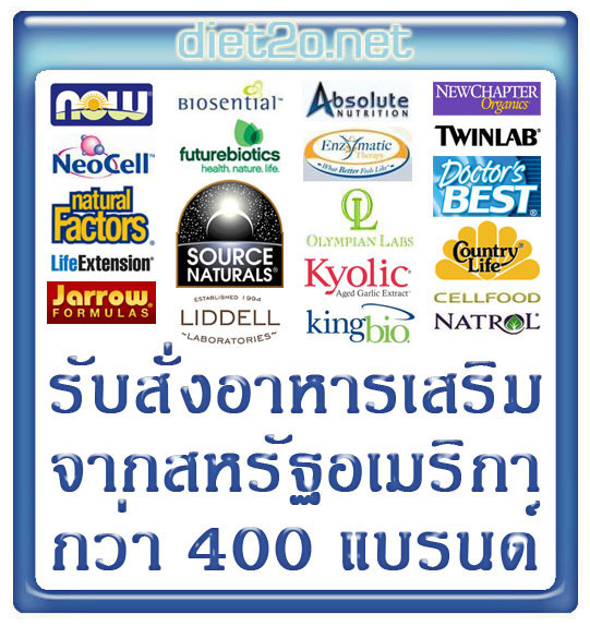 รับสั่งอาหารเสริมทุกชนิดแบรนด์ NOW, Life Extension, Natural Factors, CELLFOOD, Kyolic, Neocell, Jarrow Formulas, Twin Lab, Source Naturals, Natrol, Nature's Way, New Chapter, Olympian Labs, Only Natural, California Natural, Absolute Nutrition, Doctor's Best, Solaray, MuscleTech และอีกกว่า 400 แบรนด์ จากสหรัฐอเมริกา เช็คแบรนด์อาหารเสริมได้ที่ www.diet2o.net