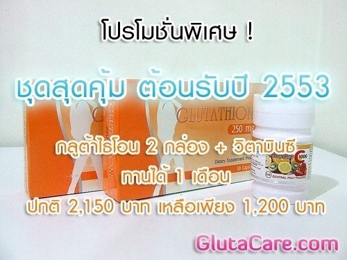 สารกลูต้าไธโอนเป็นสารต้านอนุมูลอิสระชนิดหนึ่ง ที่สามารถยังยั้งการสร้างเม็ดสีผิวได้ เมื่อทานกลูต้าไทโอนติดต่อกันสักระยะหนึ่ง จะทำให้ผิวค่อยๆขาวขึ้นได้เพื่อผลที่ดีควรทานคู่กับวิตามินซีปริมาณสูง(1000มก.)ด้วย GlutaCare.comจำหน่ายผลิตภัณฑ์กลูต้าไธโอนGlutathioneของแท้ มีอย.รับรองปลอดภัยและเห็นผลจริง!! อาหารเสริมกลูต้าไทโอนขนาด 250 มก. 1 กล่อง บรรจุ 30 แคปซูล ราคา 540 บาท โปรโมชั่นพิเศษกลูต้าไธโอน2 กล่อง + วิตามินซี 1000มก. 30 เม็ด ราคาเพียง 1200 บาทเท่านั้น!! สาวยุคใหม่ ศึกษาข้อมูลให้ดี อย่าปล่อยให้เขาหลอก !!