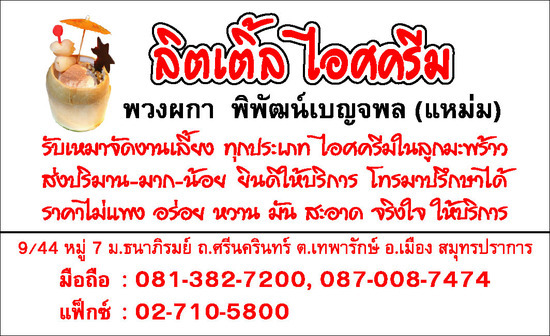 ไอศครีมกะทิสดในลูกมะพร้าว รับเหมาจัดงานเลี้ยงทุกประเภท งานเล็ก งานใหญ่ พร้อมมะพร้าวอ่อน และเครื่องไอศครีม ราคาไม่แพง สะอาด หอม หวาน อร่อย เย็น ชื่นใจ โทร.มาสอบถามก่อนได้คะ