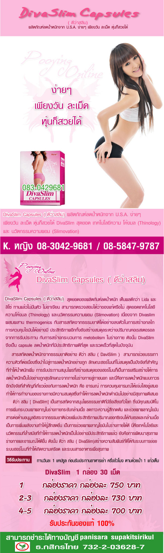 หากคุณลองมาแล้วไม่ได้ผลอย่าเพิ่งท้อค่ะลองdiva slim ดีว่าสลิม ผลิตภัณฑ์ลดน้ำหนักจาก USA ง่ายๆ เพียงวัน ละเม็ด หุ่นก็สวยได้ สินค้าคุณภาพสูง กำจัดไขมันเฉพาะส่วนได้อย่างได้ผล