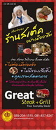 แฟรนไชส์ Great Steak & Grill ใช้วัตถุดิบคุณภาพดี อาทิ เนื้อหมูจากฟาร์มและโรงงานมาตรฐานส่งออก เนื้อโคขุนสามสายพันธุ์ ฯลฯ http://www.manager.co.th/SMEs/ViewNews.aspx?NewsID=9510000029401 มีทั้งเมนูสเต็ก สปาเก็ตตี้ ข้าว เกี๊ยวซ่า ฯลฯ สนใจติดต่อคุณจุ๊บแจง Tel. 089 204 1515, 081 869 3013