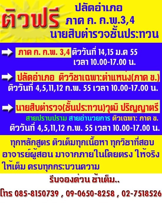 --> ติวฟรี นายสิบตำรวจ(ชั้นประทวน) ปริญญาตรี สายอำนวยการ และ สายปราบปราม วันที่ 4,5,11,12 ก.พ. 55 เวลา 10.00-17.00