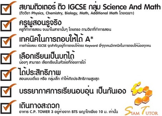 Siam Tutor ติวสอบ IGCSE เปิดสอน วิชา Math ( 0580 Mathematics extended, 0607 International math) , 0625 Physics , 0610 Biology , 0620 Chemistry , 0654 Co-ordinate science , 0653 Combined science ทั้ง core และ extended โดยอาจารย์ที่จบการศึกษามาจากทางด้านนั้นๆ โดยตรง ส่วนหนี่งที่เป็นจุดเด่นของสยามติวเตอร์ที่มีความแตกต่างจากสถาบันอื่น คือ เราเชื่อว่า ครูแต่ละคนย่อมมีความชำนาญเฉพาะด้านเท่านั้น ไม่มีครูท่านใดที่สามารถสอนได้ทุกวิชา ดังนั้นการสอนที่ได้ผลที่สุดคือการสอนโดยครูที่มีความชำนาญเฉพาะด้านนั้นๆ โดยตรง ซึ่งสยามติวเตอร์เป็นสถาบันที่เน้น กลุ่มวิชาทางด้าน science และ math โดยเฉพาะ โดยพี่ๆ มีกลยุทธ์การสอน และการฝึกการเขียนตอบเพื่อให้น้องๆ ได้คะแนนดีๆ ซึ่งจากประสบการณ์การสอน ที่พี่ๆ ทุกคนได้วิเคราะห์มา พบว่าการสอบ IGCSE เป็นข้อสอบที่ไม่ยาก เน้นความเข้าใจ และคำถามส่วนใหญ่สามารถนำมาใช้จริงได้ในชีวิตประจำวัน แต่ความยากอยู่ที่เป็นข้อสอบที่ผู้สอบสามารถตอบได้แบบอัตนัย (เติมคำตอบ) ส่วนที่มักจะทำให้น้องๆ ไม่ได้คะแนนตามที่คาดไว้คือ การตอบให้ตรงกับ keyword ซึ่งเป็นส่วนสำคัญที่นำมาใช้ในการให้คะแนน