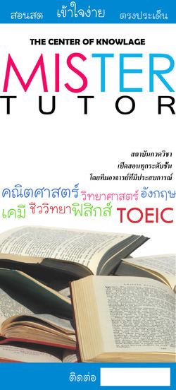 Mr.Tutor ศูนย์กวดวิชา private class เปิดสอนทุกระดับชั้นในทุกสาขาวิชา ภาษาอังกฤษ คณิตศาสตร์ วิทยาศาสตร์ ฟิสิกส์ เคมี ชีววิทยา และTOEIC โดยเน้นกลุ่มย่อย ไม่เกิน8 คน โดยอาจารย์ระดับปริญญาโทขึ้นไป ประสบการณ์กว่า10 ปี รับรองผลให้ทุกรายวิชา จะมาเดี่ยวหรือมาเป็นกลุ่มลดทุกคอร์ส