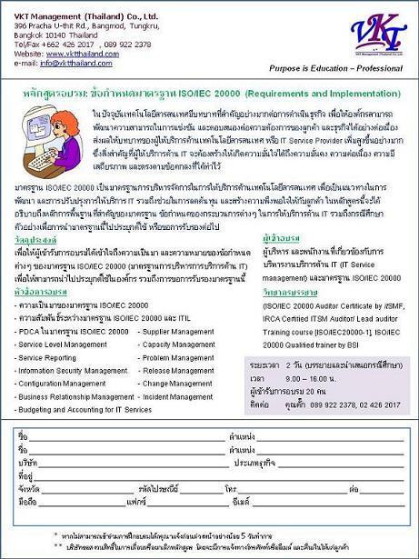 ในหลักสูตรนี้จะได้อธิบายถึงหลักการพื้นฐานที่สำคัญของมาตรฐาน ข้อกำหนดของกระบวนการต่างๆ ในการให้บริการด้าน IT รวมถึงกรณีศึกษาตัวอย่างเพื่อการนำมาตรฐานนี้ไปประยุกต์ใช้ หรือขอการรับรองต่อไป