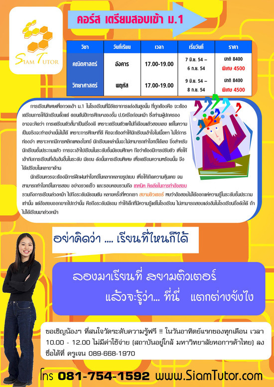 สยามติวเตอร์ จึงเปิด PRE-test สำหรับชั้น ม.1 ขึ้น เพื่อให้ผู้ปกครองทราบได้ว่าบุตรหลานของท่าน พร้อมสำหรับการสอบเข้าหรือไม่ สนใจ วัดระดับความรู้ฟรี !! ในวันอาทิตย์แรกของทุกเดือน เวลา 10.00 - 12.00 ไม่มีค่าใช้จ่าย (สถาบันอยู่ใกล้ มหาวิทยาลัยหอการค้าไทย) ลงชื่อได้ที่ ครูเจน 089-668-1970