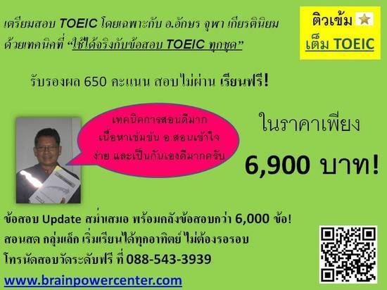 (กรุณา click ที่รูปเพื่อดูรายละเอียดด้านบน) จุดเด่นของเรา สถาบันเน้นสอนสด กลุ่มเล็ก ดังนั้น อาจารย์จึงดูแลและเอาใจใส่นัก เรียนได้อย่างทั่วถึง สอนสนุก เป็นกันเอง พร้อมเคล็ดไม่ลับในการจำคำศัพท์อย่างง่ายดาย (Viva Vocab ),การเดาความหมายของคำศัพท์ (Word Guessing),กฏไวยากรณ์สำหรับการสอบ (Essential Grammar Rules),การทำข้อสอบ Critical Reading ให้ทันเวลา การเรียนกลุ่มเล็ก อ.สามารถวิเคราะห์ได้ทั้งข้อดีและสิ่งที่นักเรียนควรได้รับการพัฒนาอย่างตรงจุด แตกต่างจากการเรียนกลุ่มใหญ่ / ทีวี / คอมพิวเตอร์ซึ่งอาจารย์ไม่สามารถทราบพื้นฐานของนักเรียนได้ว่าควรพัฒนาเรื่องใด และนักเรียนก็ไม่สามารถถามครูผู้สอนได้เพราะสถานการณ์และบรรยากาศไม่เอื้ออำนวย ทางสถาบันคัดเลือกอาจารย์ทั้งชาวไทยและชาวต่างชาติ ที่มีประสบการณ์สอนโดยตรงและผ่านมาตรฐานการสอนสากล (Tesol, Tefl) เท่านั้น (*เพื่อให้มั่นใจในมาตรฐานการสอน ทางสถาบันจึงมีการตรวจ lesson plans, observe class และร่วมมือพัฒนาการสอนกับครูผู้สอนอย่างสม่ำเสมอ) จากประสบการณ์การสอนมากกว่า 10 ปี อาจารย์ผู้สอนจึงมีความเชี่ยวชาญและได้รวบรวมเทคนิคการทำข้อสอบที่ใช้ได้จริงกับข้อสอบโทอิคทุกชุด ข้อสอบมีการ update สม่ำเสมอ ไม่ตก trend เพราะเรามีคลังข้อสอบกว่า 6,000 ข้อ! รับรองผลสอบ 650 คะแนน สอบไม่ผ่าน เรียน เริ่มเรียนได้ทุกอาทิตย์ ไม่ต้องรอรอบ โทรหาเราได้ 088-543-3939 หรือดูรายละเอียดเพิ่มเติมที่ www.brainpowercenter.com