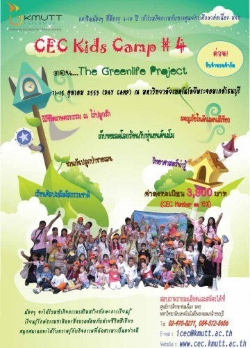 ค่ายเด็ก CEC Kids Camp ค่ายช่วงปิดเทอมที่มหาวิทยาลัยเทคโนโลยีพระจอมเกล้าธนบุรี ศูนย์การศึกษาต่อเนื่อง มจธ มหาวิทยาลัยเทคโนโลยีพระจอมเกล้าธนบุรี ชวนน้องๆ อายุระหว่าง 6-10 ปีมาร่วมกิจกรรมค่ายพัฒนาเด็กและเยาวชน ณ มหาวิทยาลัยเทคโนโลยีพระจอมเกล้าธนบุรี พบกับกิจกรรม CEC Kids Camp # 4 ตอน "The Greenlife Project" วันที่ 11-15 ตุลาคม 2553 ณ มหาวิทยาลัยเทคโนโลยีพระจอมเกล้าธนบุรี สอบถามรายละเอียดเพิ่มเติมได้ที่ ศูนย์การศึกษาต่อเนื่อง มจธ มหาวิทยาลัยเทคโนโลยีพระจอมเกล้าธนบุรี Telephone : 02 470 8271-75