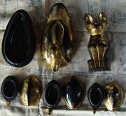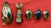 เป็นตลับทำจากไม้(ยกเว้นแมว) ไม่ทราบไม้อะไรน้ำหนักเบา งานลายรดน้ำ ลงรักปิดทอง สภาพสมบูรณ์เกือบ 100% ขนาด เป็ด 6.5x12 ซ.ม.แมว 3.5x11 ซ.ม เต่าหลังดำ 4.5x7 ซ.ม. เต่าใหญ่ 4.5x7.5 ซ.ม. เต่าเล็ก 4x6.5 ซ.ม. เอาไว้ใส่ของเล็กๆน้อยๆหรือจะใส่ตู้โชว์ไว้เป็นเครื่องรางนำโชคก็ได้ เพราะเต่ากับแมวถือว่าเป็นสัตว์นำโชคเช่นกัน ไม่แพงอย่าที่คิด