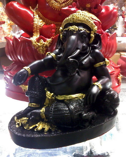 พระพิฆเนศปางเสวยสุข (ปางเอกเขนก) เนื้อเรซิ่นสีดำคาดทอง ขนาดสูง 6.5 นิ้ว ฐาน 6 นิ้ว สวยงามมากๆครับ ราคาเช่าบูชาถูกครับ 580.-