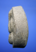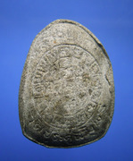 ขนาดประมาณ 1.7 X 2.2 c.m. เนื้อเทาปนสีเขียวเข้ม ฝังตะกรุด หลังยันต์ดวง