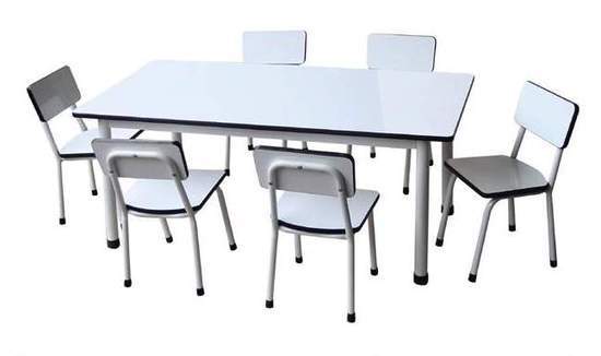 ชุดโต๊ะอนุบาล ปังปอนด์ โต๊ะ ขนาด 60 x 120 x H 50 cm โฟเมก้าขาว สำหรับห้องเรียนอนุบาล ขนาดเก้าอี้ 25 x 28 x H 54 cm โฟเมก้าสีขาว โครงขาเหล็กพ่นสีฝุ่นอิพ๊อคซี่สีบรอนซ์ซิลเวอร์ หนึ่งชุดประกอบด้วยโต๊ะ 1 ตัว เก้าอี 6 ตัว