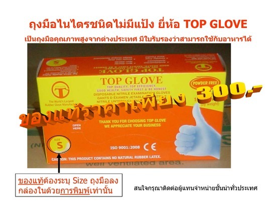 ถุงมือไนไตรชนิดไม่มีแป้ง ยี่ห้อ TOP GLOVE เป็นถุงมือคุณภาพสูงจากต่างประเทศ มีใบรับรองว่าสามารถใช้กับอาหารได้ ราคาเพียง 300.-/กล่อง