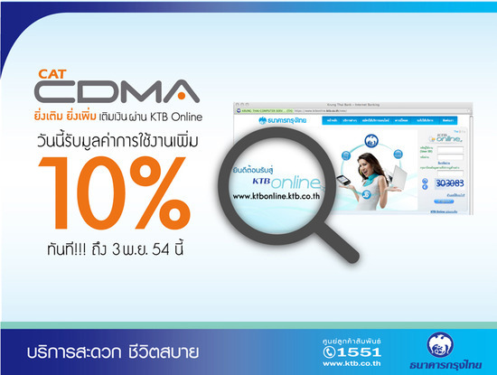 CAT CDMA เพิ่มช่องทางเติมเงินให้ลูกค้าสะดวกสบายยิ่งขึ้น เมื่อเติมเงินผ่าน KTB Online ของธนาคารกรุงไทย ทั้งทางอินเทอร์เน็ตและโทรศัพท์มือถือ รับฟรีมูลค่าการใช้งานเพิ่มอีก 10% ของราคาเติมเงิน ตั้งแต่วันนี้ -3 พ.ย.2554