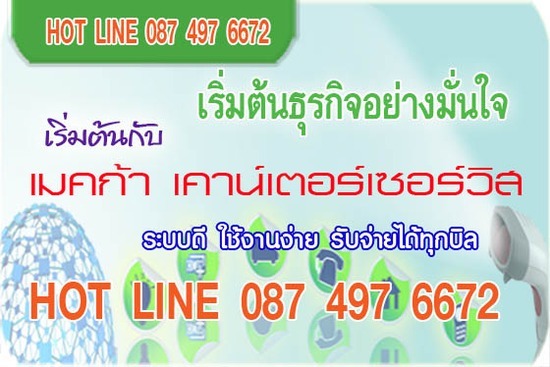 >>> หากคุณมีหน้าร้านอยู่แล้ว เช่น ร้านมินิมาร์ท ร้านขายหนังสือ ร้านเช่าหนังสือ ร้านเช่า VCD หอพัก ร้านถ่ายรูป ร้านอินเตอร์เน็ต ร้านอาหาร หรือร้านอื่นๆ ที่มีฐานลูกค้าอยู่แล้ว หรือจะเริ่มต้นธุรกิจใหม่ก็นับว่าเป็นธุรกิจที่มีการลงทุนน้อยและความเสี่ยงต่ำเมื่อเทียบกับเงินลงทุน และเป็นธุรกิจที่มีอัตราเติบโต 15-20 เปอร์เซ็นต์ คำนวณรายได้คร่าวๆ ว่า บริเวณที่คุณอยู่ มีจำนวนครัวเรือน 1,000 ครัวเรือน คุณสามารถมีรายได้สูงสุดต่อเดือนถึง 45,000 บาท เมคก้าเคาน์เตอร์เซอร์วิส นำเสนอ สุดยอดของ ระบบรับฝากชำระค่าสินค้า/ค่าบริการออนไลน์ และระบบเติมเงินโทรศัพท์เคลื่อนที่ออนไลน์ รองรับการประกอบธุรกิจอย่างตรงไปตรงมา ทำงานง่าย แม้คนที่ไม่เก่งคอมพิวเตอร์ ทำให้คุณมีรายได้เพิ่มจากการเปิดจุดรับชำระค่าบริการและเติมเงินออนไลน์ โดยไม่ต้องลงทุนค่าเฟรนไชส์หลายหมื่น ไม่ต้องมีเงินประกันหลายหมื่น สามารถบริหารรายได้ได้เอง ด้วยความเสี่ยงน้อย เงินลงทุนต่ำ ระบบดี ใช้งานง่าย รับจ่ายได้ทุกบิล สนใจเริ่มต้นธุรกิจจุดรับชำระค่าบริการและเติมเงินออนไลน์ โทรสอบถามเพิ่มเติม 087-497-6672 (ฝ่ายลูกค้าสัมพันธ์) ยินดีให้คำแนะนำ หรือดูรายละเอียดได้ที่ http://www.megacounterservice.com