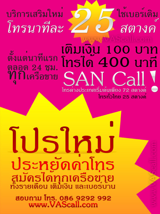 โทร 25 สตางค์ ตลอด 24 ชั่วโมง ทุกเครือข่าย (โปรนี้สมัครใช้ได้ทุกเครือข่าย รายเดือน และเบอร์บ้านก็โทร โปร 25 สตางค์ได้) , SANcall , โทรถูก
