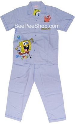 ชุดนอนเด็กสปองบ๊อบ(SpongeBob) ขายาว แขนสั้น คอปก ผ้าชิโนริ ของแท้ ราคาถูก