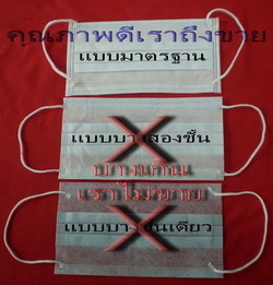 ขายส่ง หน้ากากอนามัย คุณภาพมาตรฐาน ใช้ป้องกันไข้หวัดใหญ่ 2009 เพื่อสุขภาพอนามัย เพียงกล่องละ 125 บาท (บรรจุ 50 ชิ้น) ++ เฉลี่ย 2.50 บาท/ชิ้น เท่านั้น ++ ราคานี้สำหรับการสั่งขั้นต่ำ 1ลัง (40กล่อง) ท่านใดต้องการสั่งต่ำกว่า 1ลัง หรือสั่งเป็นจำนวนมาก กรุณาโทรสอบถามรายละเอียดเกี่ยวกับราคาสนใจติดต่อ... อนุกูล 081-3122968,083-2962772 อรรณพ 085-4014999 ***มีสินค้าพร้อมจัดส่ง***