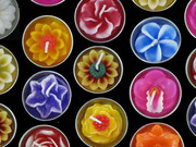 เทียนดอกไม้ในถ้วยทีไลท์ มีหลายแบบมาก เช่นกุหลาบ มะลิ กล้วยไม้ ราคากล่องละ 3800 บาทมี 100 แพ็ค ราคาส่ง 2700 บาท 4 กล่องขึ้นไป