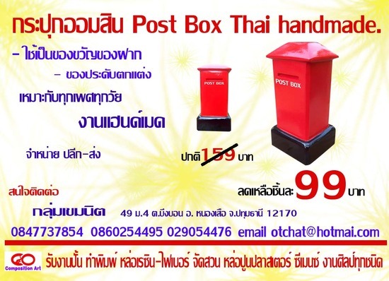 กระปุกออมสินตู้ไปรษณีย์กว้าง7.5 ยาว 8.5 สูง16.5 เซนติเมตร วัสดุปูนปลาสเตอร์ ทำสี ราคา 99 จาก 159 บาท สั่งซื้อที่ กลุ่มเขมนิต 49ม.4ต.บึงบอนอ.หนองเสือจ.ปทุมธานี 12170 จำหน่ายปลีก-ส่ง ทั่วประเทศ otchat@h