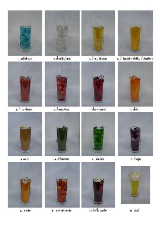 นอกจากแบบจำลองเครื่องดื่มที่นำมาแสดงในภาพแล้ว เรายังมีน้ำอื่น ๆ เช่น นมสด น้ำแอปเปิ้ล น้ำแครอท ฯลฯ และท่านยังสามารถสั่งสีพิเศษตามความพอใจ
