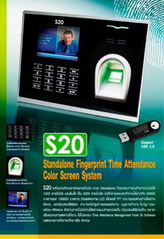 เครื่องลงเวลาสแกนลายนิ้วมือดีที่สุด s20 ประสิทธิภาพเครื่อง s20 - จอสีเมนูภาษาไทยใช้งานง่าย - ป่มกดทัชสกรีน - ใช้งานได้ถึง 3000 คน จดจำข้อมูลได้ถึง 100,000 ครั้ง - หัวอ่านลายนิ้วมือเป็นชนิด Optical ใหม่ล่าสุดผิวกระจกเคลือบแข็งทนทาน และสามารถปรับให้เข้ากับแสงสว่าง ภายนอกได้อัตโนมัติ ใช้ได้กับทุกสถานที่ - สามารถใช้งานเป็นแบบสแกนลายนิ้วมือ หรือ Password - การประมวลผลความเร็วสูง < 1 วินาที ไม่ว่าจะใช้งานรูปแบบ 1:1, 1:N - มีโปรแกรมสำเร็จรูปใช้งานเป็นภาษาไทย - ทำงานอิสระ Standalone มีเสียงตอบรับเป็นภาษาไทย
