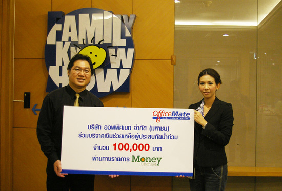 ออฟฟิศเมทร่วมใจช่วยเหลือผู้ประสบภัยน้ำท่วม คุณวรวุฒิ อุ่นใจ (ซ้าย) ประธานกรรมการบริหารและกรรมการผู้จัดการ บริษัท ออฟฟิศเมท จำกัด (มหาชน) มอบเงิน จำนวน 100,000 บาท (หนึ่งแสนบาท) เพื่อช่วยเหลือผู้ประสบภัยน้ำท่วม โดยคุณปาริชาต พรหมโยธี (ขวา) พิธีกรประจำรายการ Money Channel เป็นผู้รับมอบเงินดังกล่าว ณ อาคารตลาดหลักทรัพย์แห่งประเทศไทย เมื่อเร็ว ๆนี้