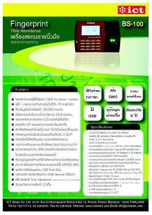 BS-100 เป็นเครื่องบันทึกลงเวลาพนักงาน ( Time Attendance )ด้วยลายนิ้วมือ( Fingerprint )ที่มีประสิทธภาพสูง หัวอ่านทนต่อรอยขูดขีด ไม่ใช้หน้าสัมผัสหัวอ่านที่เป็นยาง จึงไม่ต้องกังวลต่ออายุการใช้งาน และสามารถทำความสะอาดได้ง่าย