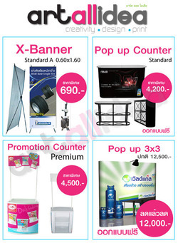 ผลิตอุปกรณ์ออกบูธสินค้า,ป้ายโฆษณาต่าง ๆ และอุปกรณ์ออกบูธสำเร็จรูปมากมาย ทั้ง บูธ , Roll up, Pop up, pull frame, Backdrop, Counter Promotion, โต๊ะชงชิม, X Banner, Back Wall, Poster Stand, Standee Borad ,Brochure stand ฉากนิทรรศการ ออกบูธ ฯลฯ