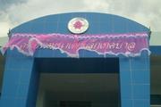 @ ป้ายพิธี (คัทเอาท์ชื่องาน) ขนาด 2.40 x 4.80 เมตร ติดข้อความ พร้อมตกแต่งระบายผ้า ประดับธง