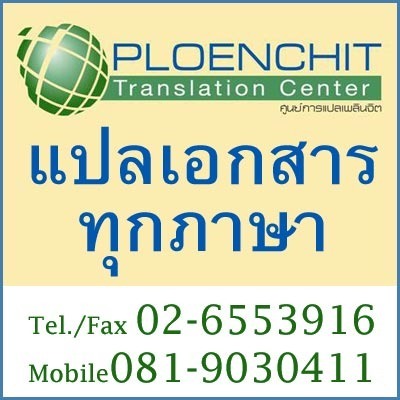 | รับแปลเอกสารทุกภาษา | รับรองความถูกต้องตามกฎหมาย จากกระทรวงการต่างประเทศ และสถานทูต | รับรองผู้เชี่ยวชาญจาก กระทรวงยุติธรรมและโนตารี่พับลิค | บริการล่ามทั้งในและนอกสถานที่ 2nd Floor, Wave Place Building, 204/2, Witthayu Road, Lumphini, Pathumwan, Bangkok 10330, Thailand, Tel. & Fax. 02-6553916 โทรศัพท์มือถือ 081-9030411 email: [email protected] | Typing and Translation Affirmation of Freedom to Marry Service | Translation Service | Arrange your translated Thai official documents to be legalized at The Ministry of Foreign Affair and Embassy | Notary Public Service | Interpretation Service เราคือผู้เชี่ยวชาญอย่างแท้จริง รับแปลเอกสารทุกภาษาไม่ว่าจะเป็นบทความทั่วไป นวนิยาย การแพทย์ สัญญา วิศวกรรม โบรชัวร์ เว็ปไซด์ ฯลฯ ราคายุติธรรม PLOENCHIT TRANSLATION - บริการแปลเอกสารทุกภาษา เช่น อังกฤษ ฝรั่งเศส เยอรมัน จีน เกาหลี ญี่ปุ่น ลาว พม่า รัสเซีย ฯลฯ โดยผู้เชี่ยวชาญแต่ละสาขา ทั้งอาจารย์ชาวไทยและชาวต่างชาติ - บริการแปลเอกสารในการเดินทางไปต่างประเทศทุกประเทศ พร้อมรับรองเอกสาร ที่กระทรวงการต่างประเทศสถานทูตต่างๆ มีบริการด่วน - บริการพิเศษแปลไทย-เยอรมันใช้กับสถานทูตสวิตเซอร์แลนด์ แปลด่วนรอรับได้ บริษัทฯ มีรายชื่ออยู่ในสถานทูตสวิตเซอร์แลนด์ - บริการโนตารี่พับลิค - รับจดทะเบียนสมรสกับชาวต่างชาติพร้อมให้คำปรึกษา - บริการขอวีซ่าทุกประเทศ และให้คำปรึกษา - ตั๋วเครื่องบินและประกันการเดินทาง PLOENCHIT TRANSLATION (เพลินจิต ทรานสเลชั่น) provides local quality service in more than 30 languages We offer the following services to our clients : - Translations in all languages - Marriage Registration Service (Foreigners and Thai) - Translations legalized by Ministry of Foreign Affairs - Translations legalized by Embassy of Switzerland (German, French, Italian) - True Translation is in the list of the Embassy of Switzerland. - Translations legalized by a Legal Specialist of Ministry of Justice - Travel Insurance - Air Tickets - Visa Consulting - Notary Public E-mail : [email protected] หากต้องการความมั่นใจในงานแปลเอกสาร ต้องเราเท่านั้น "บริการแปลเอกสาร - รับแปลเอกสาร" เพราะเรามีทีมงานแปลเอกสารที่เป็นผู้เชี่ยวชาญด้านนี้โดยตรง