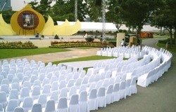 · ค่าบริการตั้งเก้าอี้พลาสติกสีขาว Superware คลุมผ้าขาวยาวถึงพื้น วันแรก 35.-