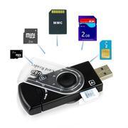 สำหรับอ่าน/เขียนซิมการ์ด ช่วยให้เรานำเบอร์โทรศัพท์ที่อยู่ในซิมการ์ดไปเก็บไว้ในคอมพิว เตอร์ได้อย่างง่ายดาย พร้อมยังสามารถแก้ไขหรือเพิ่มเบอร์โทรชื่อคนจากคอมพิวเตอร์แล้วนำเข้ากลับไปเก็บไว้ในซิมการ์ดได้อีกด้วย ไม่ต้องกลัวปัญหาเรื่องเบอร์โทรศัพท์หายอีกต่อไป นอกจากนี้ยังสามารถใช้ในการอ่าน/เขียนการ์ดอื่นๆ ที่อยู่ในโทรศัพท์ กล้อง อุปกรณ์สื่อสาร ฯลฯ เช่น SD card, MMC card เป็นต้น ใช้งานง่าย ขนาดเล็กสะดวกในการพกพา Multiple USB memory card reader that makes life more simpler. Why have your work desk cluttered with several individual card readers, when you can simply have one multiple card reader that does the same job as 5 card readers. This multiple SD/MMC, micro SD/MMC and SIM card reader comes in a fashionable designed black casing with a see through protective slide casing. This is the simplest, fasted and most convenient way of transferring data, music and video files from one card format to another using your laptop or desktop computer. Further more back up all your SIM card contacts and contents with this compact form factor USB device that fits easily in your pocket, meaning it is always at your side when you need it. This USB memory card reader comes with 3 slots, two of which support SD/MM and micro SD/MMC. In addition, there is a 3rd SIM card slot on the side of the USB 2.0 card reader for cell phone SIM cards. This model is great for users utilizing a variety of flash card formats to transfer photos, music, video and work data from their computer, digital cameras and other types of digital devices. This card reader is extremely user-friendly and easy to use. Effortless installation with plug and play functionality and no need to restart the computer. It would be ideal for portable use on the road, or at home with a desktop or laptop computer.