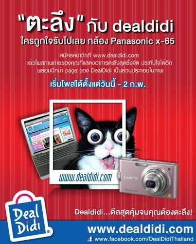 รางวัลชนะเลิศ - ได้รับกล้อง Panasonic FX – 65 1 รางวัล รางวัลรองชนะเลิศ 2 รางวัล - ได้รับเงิน wallet 2 รางวัล รางวัลละ 500 บาท กติกา - ร่วมโพสภาพตะลึง กับ DealDidi โพสภาพของตัวคุณเองที่แสดงอาการ กรี๊ดสุด, ดีใจจี๊ด, ซึ้งจัด หรือประทับใจได้ อีก กับ DealDidi พร้อมมีหน้า page facebook DealDidi หรือหน้า page http://www.dealdidi.com/">www.DealDidi.com - หรือ เพียงแค่มี logo ของ DealDidi อยู่ในภาพแสดงอาการสุดตะลึงของคุณ จากนั้นโพสภาพของคุณขึ้นที่ หน้า wall ของ http://www.facebook.com/dealdidithailand">http://www.facebook.com/dealdidithailand **หมดเขตส่งภาพ** วันที่ 6 กุมภาพันธ์ 2554 เวลา 23.59 น. การตัดสิน - ภาพที่ได้รับการ กด like เกิน 20 like จะได้ผ่านการเข้าร่วมลุ้นเพื่อตัดสิน จาก ภาพที่ประทับใจ ทีมงาน DealDidi 3 ภาพ ภาพที่ประทับใจทีมงานมากที่สุด จะได้รับรางวัลชะเลิศ Panasonic X- 65 1 รางวัล และรางวัลรองชนะเลิศ ได้รับเงิน wallet 2 รางวัล รางวัลละ 500 บาท **ประกาศผล** วันที่ 7 กุมภาพันธ์ 2554 เงื่อนไข - ผู้ร่วมเล่นเกมที่เป็นสมาชิกใหม่ จะต้องสมัครสมาชิกที่ http://www.dealdidi.com/">www.DealDidi.com และคลิก like หน้า page http://www.facebook.com/dealdidithailand%20%E0%B8%81%E0%B9%88%E0%B8%AD%E0%B8%99">http://www.facebook.com/dealdidithailand ก่อนเท่านั้นจึงมีสิทธิ์ร่วมลุ้นรางวัลได้ สมาชิกเก่ามีสิทธิ์ร่วมลุ้นได้เลย
