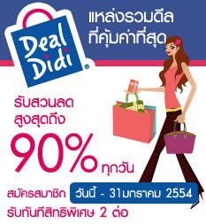 ข่าวดีๆ สำหรับคนชอบช้อปมาแล้ว ทั้งง่าย ทั้งประหยัด เปิดประสบการณ์ใหม่ในการช้อปปิ้งออนไลน์ กับ DealDidi แหล่งรวมดีลที่คุ้มค่าที่สุดและดีที่สุด รับส่วนลดสูงสุด 90% ทุกวัน สมัครสมาชิก วันนี้ ถึง 31 มกราคม 2554 รับทันทีสิทธิพิเศษ 2 ต่อ ต่อที่ 1 เลือกรับคืนทันที 100 บาท (เมื่อซื้อดีลแรก เพื่อใช้ซื้อดีลต่อไปของคุณ) หรือ รับดีลพิเศษมูลค่า 200 บาท ที่ร้านอาหารไทยฟิวชั่น 36-24-36 ต่อที่ 2 รับทันที 100 บาท (เมื่อคุณแนะนำเพื่อนมาร่วมดีลกับเรา) พิเศษ ดีลประจำเดือนมกราคม ที่น่าสนใจ DNA HACHI La Bonita by S Moods nara ONE The Orientist Spa POLKA DOT SHABU SEN สมัครสมาชิกได้ที่ http://dealdidi.com/promotion/jan2011-1/">http://dealdidi.com/promotion/jan2011-1/ สิทธิพิเศษมากมายกำลังรอให้คุณมาดีลกับเรา ของถูกและดี มีจริงอยู่ที่นี่
