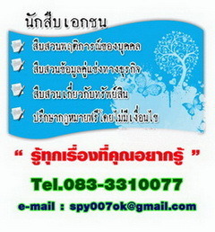 ติดต่อ คุณโหน่ง นักสืบเอกชน / มือถือ : 083-3310077 / อีเมล : [email protected] / เว็บไซต์ : http://www.detective-law.com/">http://www.detective-law.com