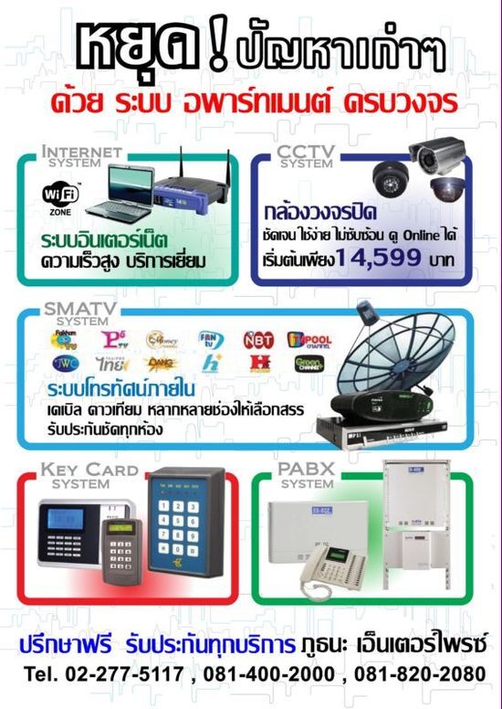 เราเป็นผู้ให้บริการมืออาชีพ ด้านการวางระบบ อินเตอร์เน็ตความเร็วสูง Wifi hot spot มากกว่า 10 ปี ด้วยระบบ Bandwidth Management และระบบ Billing ที่ทรงประสิทธิภาพ (lntelligent Broadband Subscriber Gateway) ผลงานทั้ง วางระบบเล็ก กลาง และใหญ่ 50 ห้องขึ้นไป มีให้เลือกทั้งให้เราลงทุน หรือต้องการลงทุนเอง บริการเราจะช่วยให้ท่าน ให้บริการถึงความพึงพอใจของลูกค้า และประสิทธิภาพในการจัดเก็บเงิน ที่สะดวก รวดเร็ว และชัดเจน บริการท่านโดยช่างผู้ชำนาญการโดยเฉพาะ และบริการหลังการขายที่ประทับใจ ในราคายุติธรรม พิสูจน์ได้โดยผลงานและประสบการณ์ที่ผ่านมาตลอด 10 ปี ทางเราจะเน้นคุณภาพการให้บริการเป็นหลัก เรามีความชำนาญในการให้บริการในกลุ่มลูกค้าอพาร์ทเม้น โรงแรม ห้อพัก อาคาร ฯลฯ และทางเราก็ได้มีการศึกษาระบบใหม่ ๆ เพิ่มเติม อาทิเช่น การติดตั้ง กล้องวงจรปิด CCTV เคเบิ้ลทีวี Cable TV ระบบคีย์การ์ด Key Card System และ PABX System ที่ทันสมัยในราคาย่อมเยาว์ ในวันนี้เราจึงพร้อมให้บริการแก่ท่านแล้ว เพราะท่านคือคนสำคัญของเรา สามารถโทรมาปรึกษาเราได้โดยไม่เสียค่าใช้จ่ายใดๆทั้งสิ้นได้ที่ Putana Enterprise Co.,Ltd. บริษัท ภูธนะ เอ็นเตอร์ไพรซ์ จำกัด โทร 081 400 2000 , 081 820 2080 Fax / office 02 276 8721 E:mail :