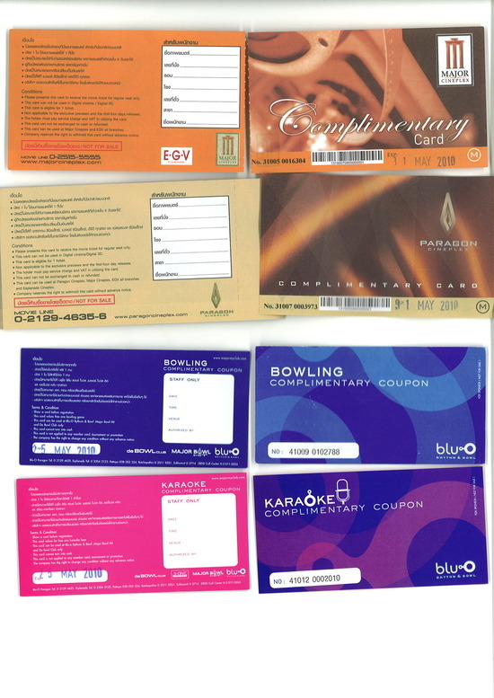 ขายบัตร เครือ เมเจอร์ โบว์ลิ่ง ราคา 140 เหลือ 70 (ต่อคน ต่อเกม) เหลือแค่ 100 ใบเท่านั้น บัตรคาราโอเกะ ราคา 450 เหลือ 225 (ต่อ 1ชม.) บัตรหนัง ใช้ได้กับ เมเจอร์ และ อีจีวี ทุกสาขา พารากอน และ เอสพลานาด (หนังใหม่ 4 วันแรกยังดูไม่ได้) ราคา 160 เหลือ 80 จำนวนจำกัดค่ะ หมดแล้วหมดเลย ด่วนๆๆๆ