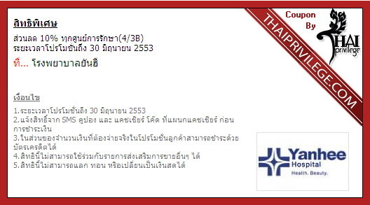 แจกคูปองส่วนลด 10% ของโรงพยาบาลยันฮี ใช้ได้ทุกศูนย์การรักษา ไม่มีขั้นต่ำค่ะ